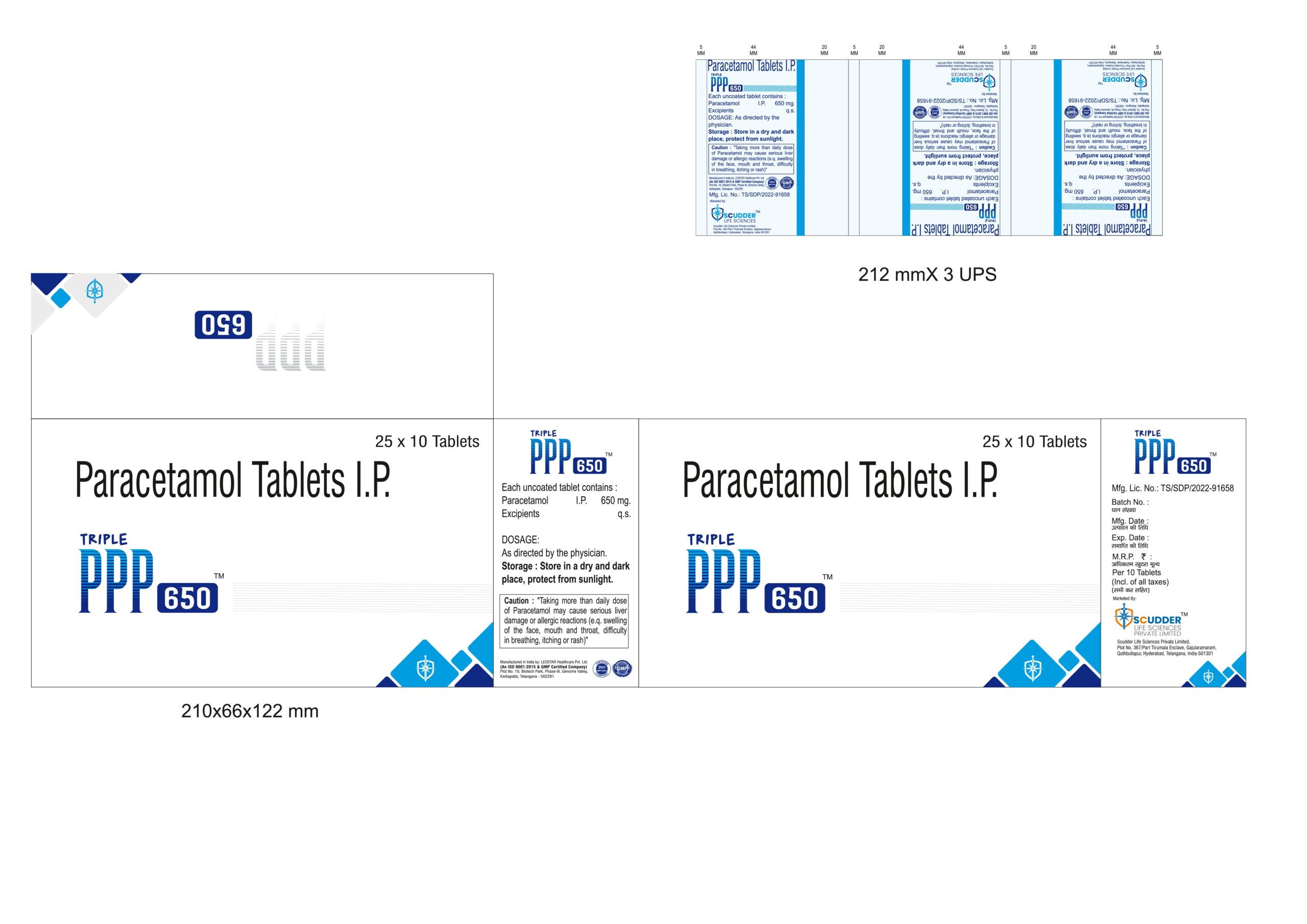 Triple PPP 650 contains Paracetamol I.P. 650 mg, a widely used and safe medication for the treatment of fever and pain. It works centrally in the brain to reduce fever and alleviate pain without causing stomach irritation commonly associated with NSAIDs.
